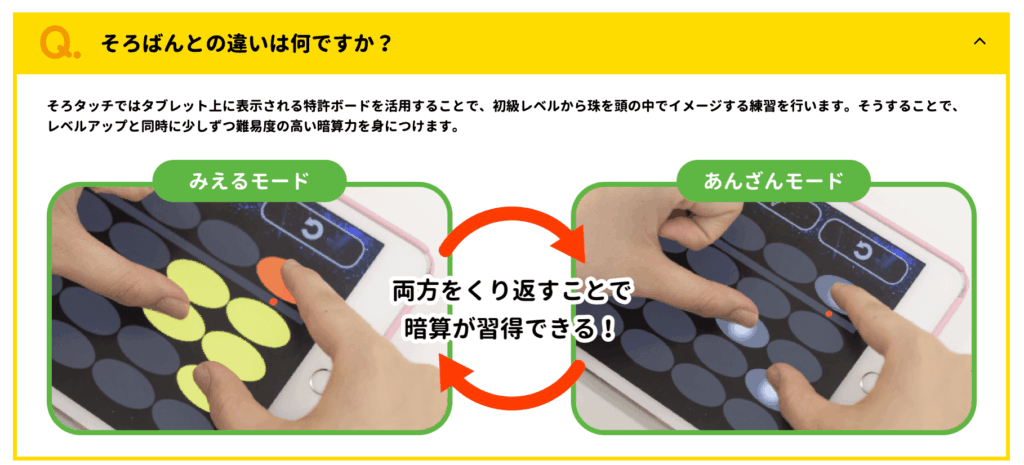 A:そろばんは実物、そろタッチはタブレットで学ぶ違いがあります。